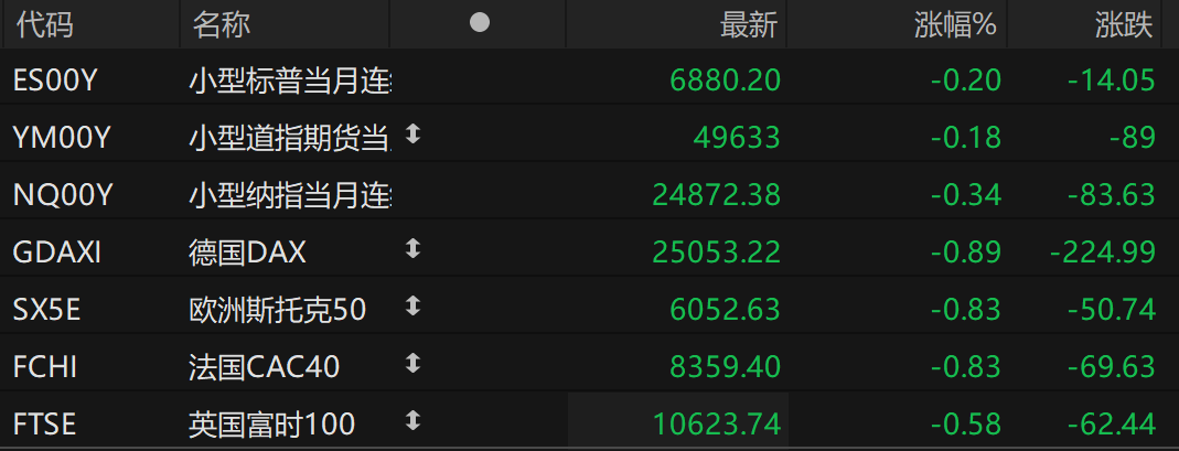 周四盘前,美股三大股指期货齐跌,欧洲主要指数普遍下跌。截至发稿,纳斯达克100指数期货跌0.34%,道指期货跌0.18%,标普500指数期货跌0.20%。
