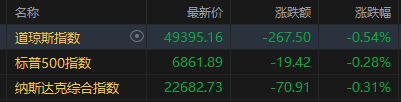 截至收盘,道琼斯指数跌0.54%,报49395.16点;标普500指数跌0.28%,报6861.89点;纳斯达克综合指数跌0.31%,报22682.73点。