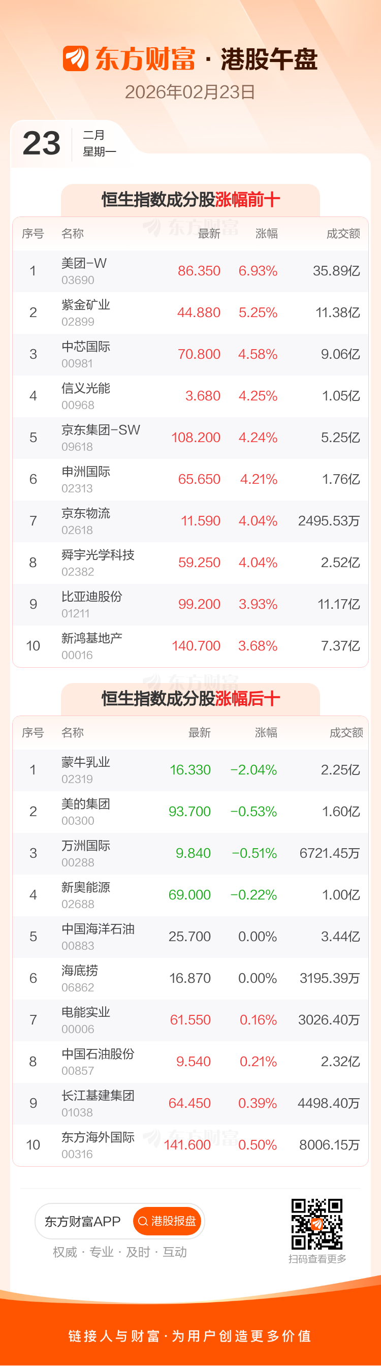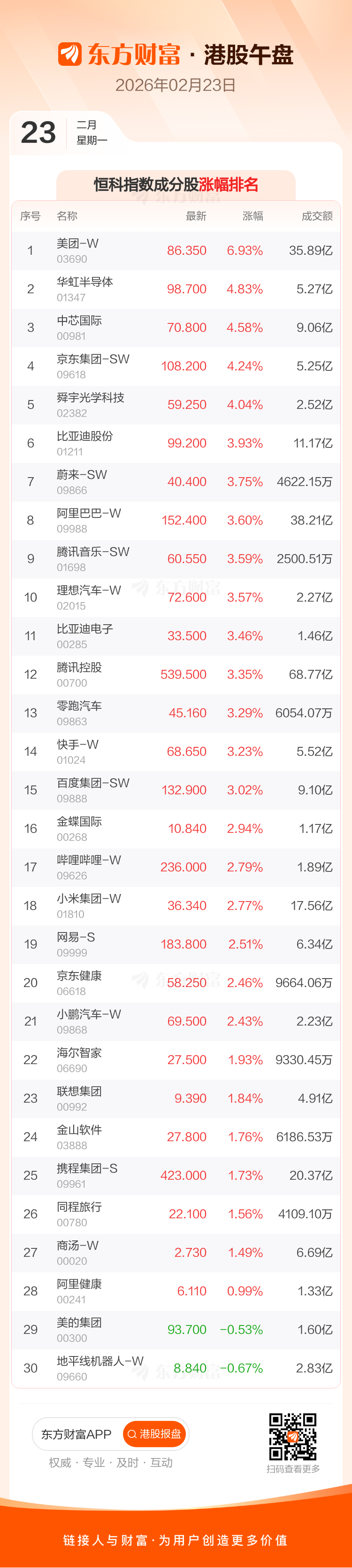 港股2月23日午盘走高,恒生指数收报27019.21点,涨605.86点,涨幅2.29%;恒生科技指数收报5384.52点,涨173.02点,涨幅3.32%。恒生指数成分股中美团-W、紫金矿业、中芯国际涨幅居前,蒙牛乳业、美的集团、万洲国际跌幅靠前。恒生科技指数成分股中美团-W、华虹半导体、中芯国际涨幅居前,地平线机器人-W、美的集团、阿里健康跌幅靠前。