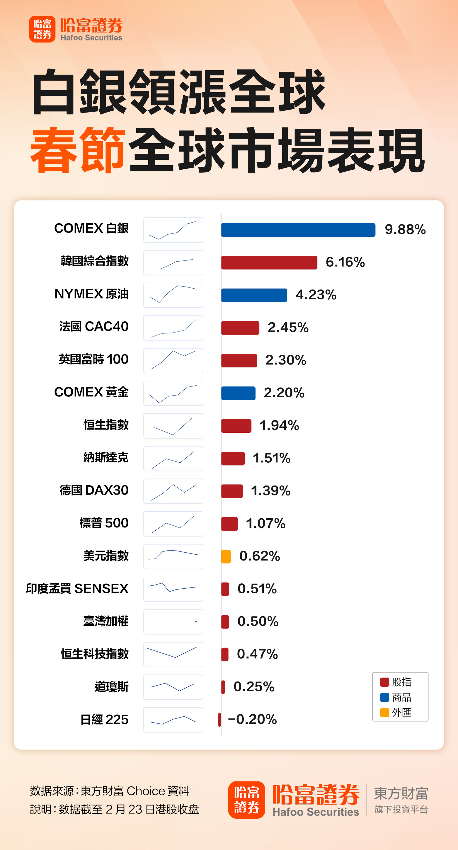 春节假期已至尾声,从假期全球资产表现来看,商品市场处于领涨之势,截至2月23日港股收盘(以下同),COMEX白银上涨9.88%,处于领跑地位。此外,NYMEX原油上涨4.23%,COMEX黄金上涨2.2%。