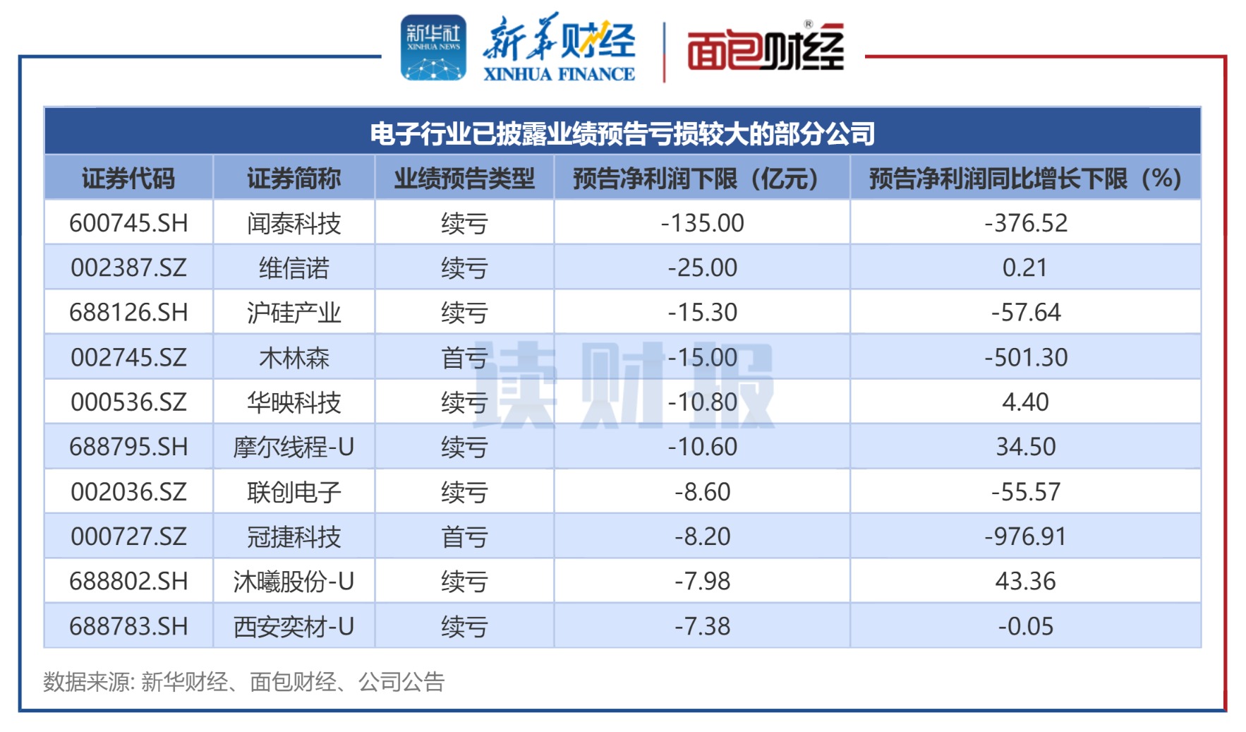 统计数据显示,电子行业所有公布业绩预告的公司中有130家亏损。其中,预告净利润下限排名前三位的公司分别是闻泰科技、维信诺及沪硅产业。