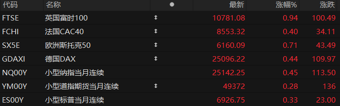 周三盘前,美股三大股指期货齐涨,欧洲主要指数普遍上涨。截至发稿,纳斯达克100指数期货涨0.45%,道指期货涨0.28%,标普500指数期货涨0.33%。