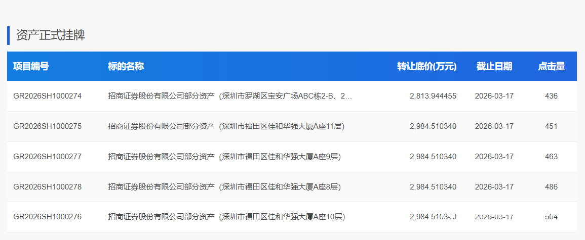 日前,湾财社记者据上海联合产权交易所披露信息发现,招商证券于2026年2月份正式挂牌转让位于深圳的五处不动产,转让底价合计约1.48亿元,挂牌期截止日期均为3月17日。