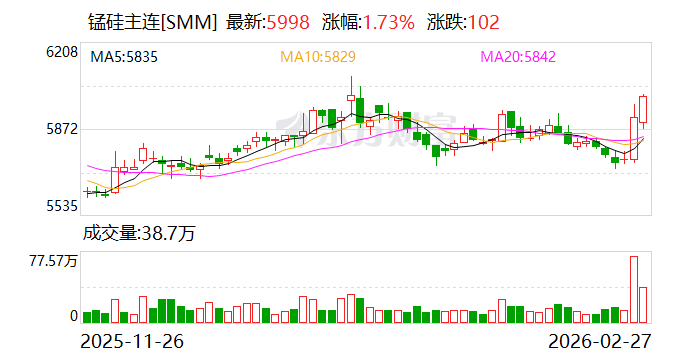 2月26日,锰硅期货主力2605合约收涨2.85%,报5918元/吨;硅铁期货主力2605合约收涨0.98%,报5538元/吨。