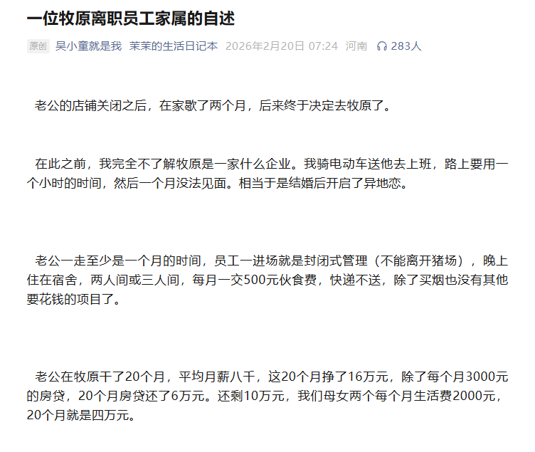 近日,一篇牧原离职员工家属的自述文章引起热议。