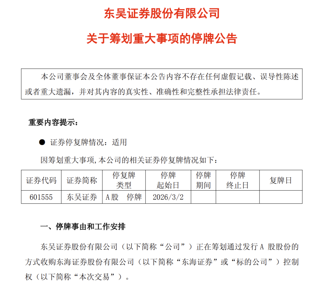 值得注意的是,本次交易是2026年首例券商并购案,东吴证券与东海证券同属江苏本土券商。