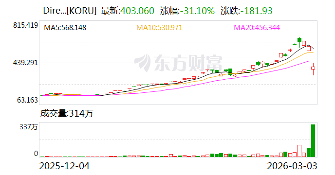 Direxion Daily South Korea Bull 3X Shares(KORU.US) (三倍做多韩国)跌超 31.10%,成交额 11.35 亿美元。
