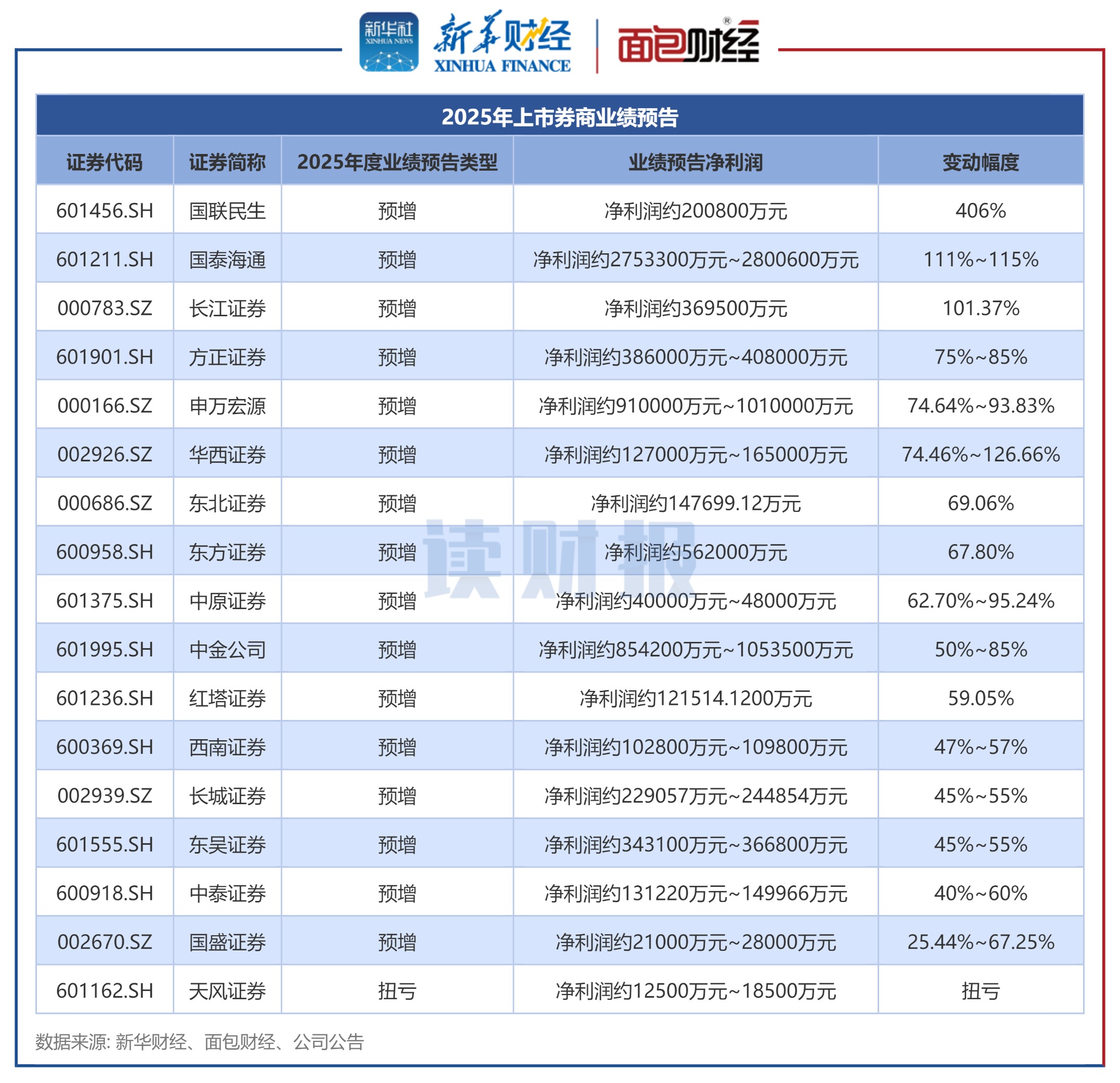 数据显示,17家披露业绩预告的上市券商中有16家预增,1家扭亏。其中,国联民生、国泰海通、长江证券的归母净利润同比增长均超过100%。此外,方正证券、申万宏源、华西证券等8家券商预计2025年归母净利润同比变动下限均在50%以上。天风证券则实现扭亏。