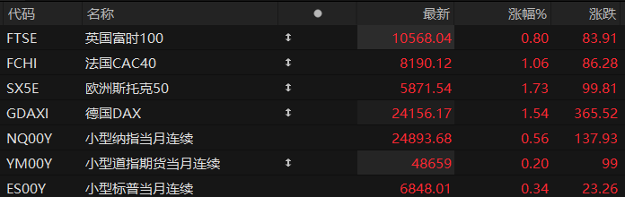 周三盘前,美股三大股指期货齐涨,欧洲主要指数普遍上涨。截至发稿,纳斯达克100指数期货涨0.56%,道指期货涨0.20%,标普500指数期货涨0.34%。