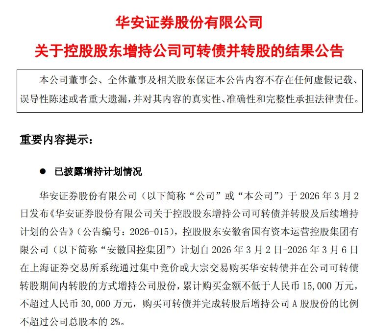 3月3日晚间,华安证券公告称,公司控股股东安徽国控集团计划于3个交易日内(3月4日至3月6日),继续通过购买公司可转债并转股的方式增持公司股份,金额不低于1亿元、不超过2亿元,本次购买可转债并完成转股后增持公司A 股股份的比例与前次已实施完成的增持计划累计不超过公司总股本的2%,两轮增持合计最高投入接近5亿元。