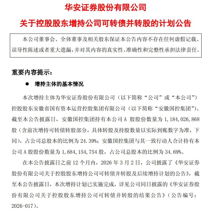 3月3日晚间,华安证券披露两份公告,控股股东安徽省国有资本运营控股集团有限公司(下称 “安徽国控集团”)已完成上一轮增持,并同步启动新一轮增持计划,向市场释放明确积极信号。