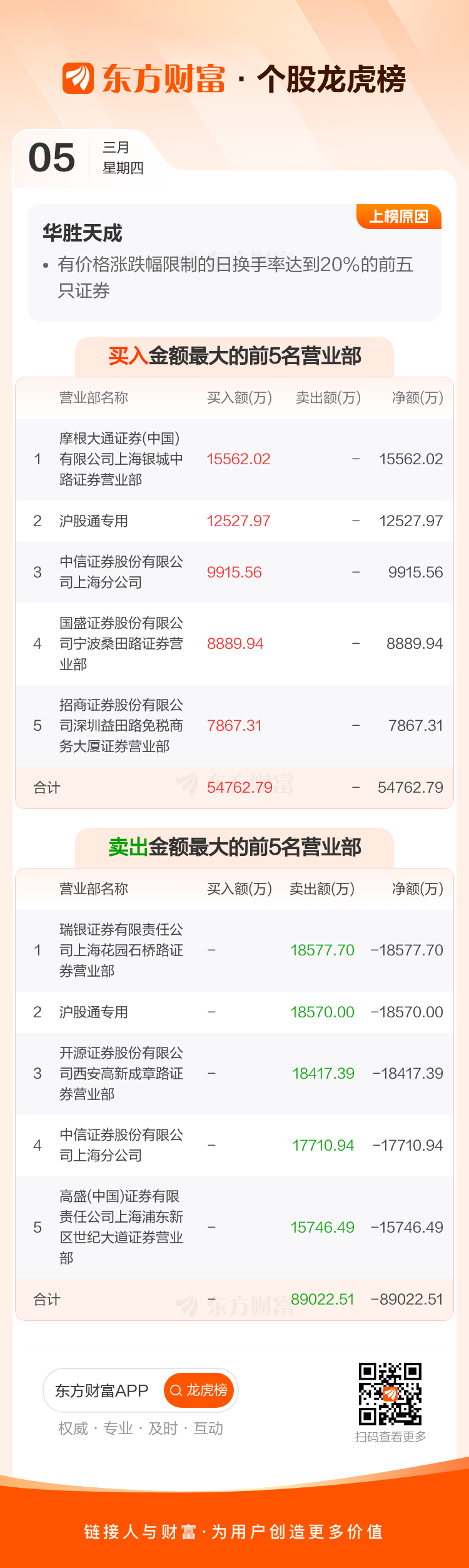 交易所2026年3月5日公布的交易公开信息显示,华胜天成因成为有价格涨跌幅限制的日换手率达到20%的前五只证券上榜。华胜天成当日收报28.35元,涨跌幅-2.44%,偏离值29.72%,换手率29.72%,成交额93.30亿。