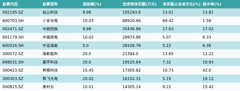 南财智讯3月5日电,盘后数据显示,因当日异动登上龙虎榜的个股中,资金净买入最多的前三位分别是岩山科技(002195.SZ)、三安光电(600703.SH)与中超控股(002471.SZ)。其中排名第一的岩山科技净买额达10.53亿元,占总成交金额的13.01%。岩山科技当日收盘上涨9.98%,换手率为13.81%,净买入额前10个股详情见下图: