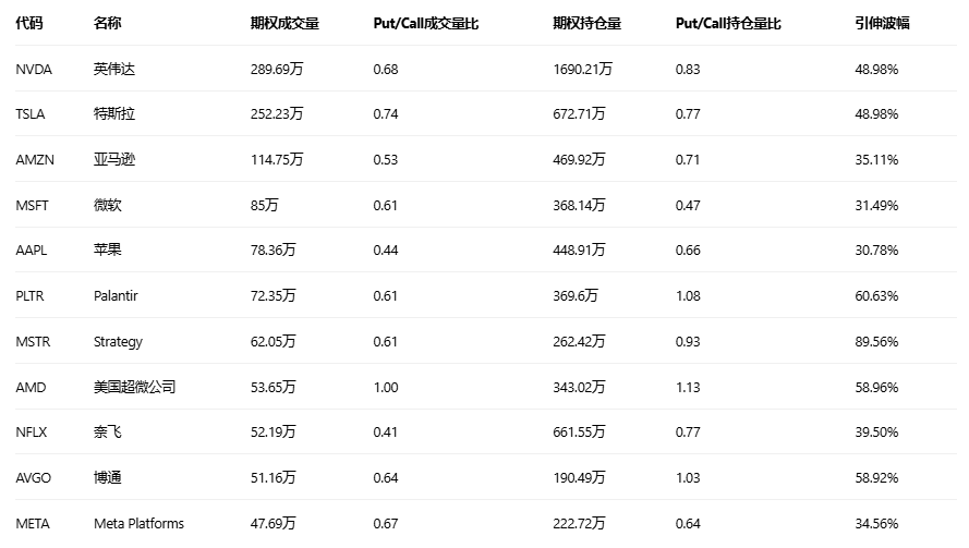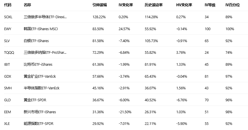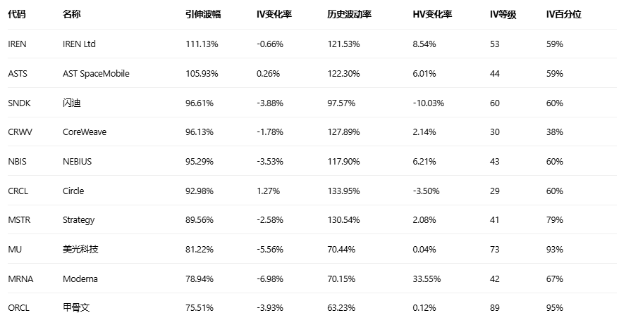 引申波幅排行榜(标的市值>10亿美元,且期权成交量>10万)