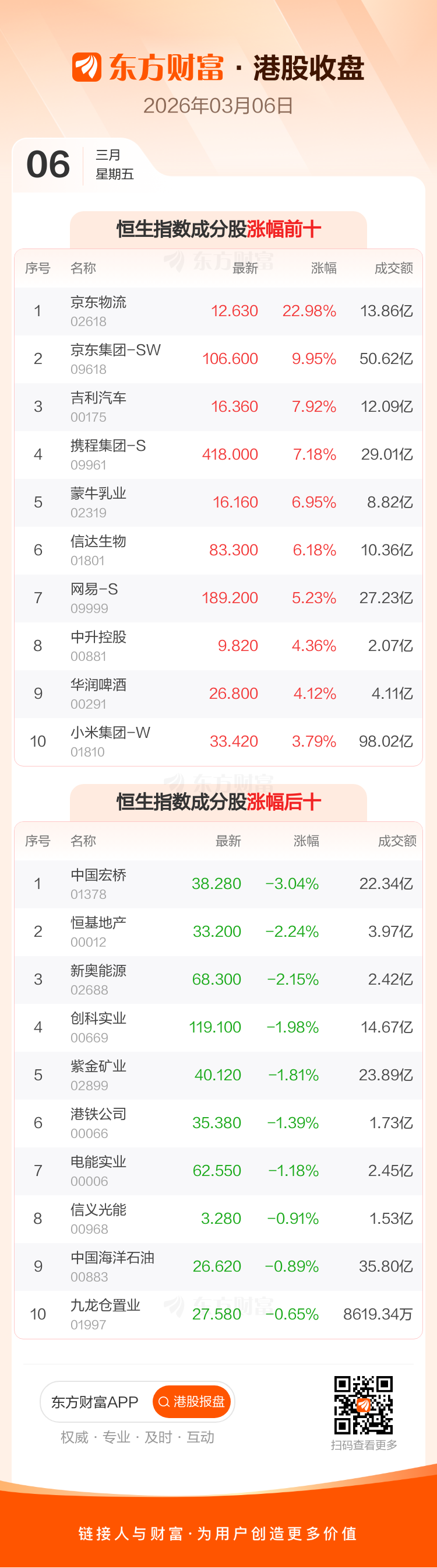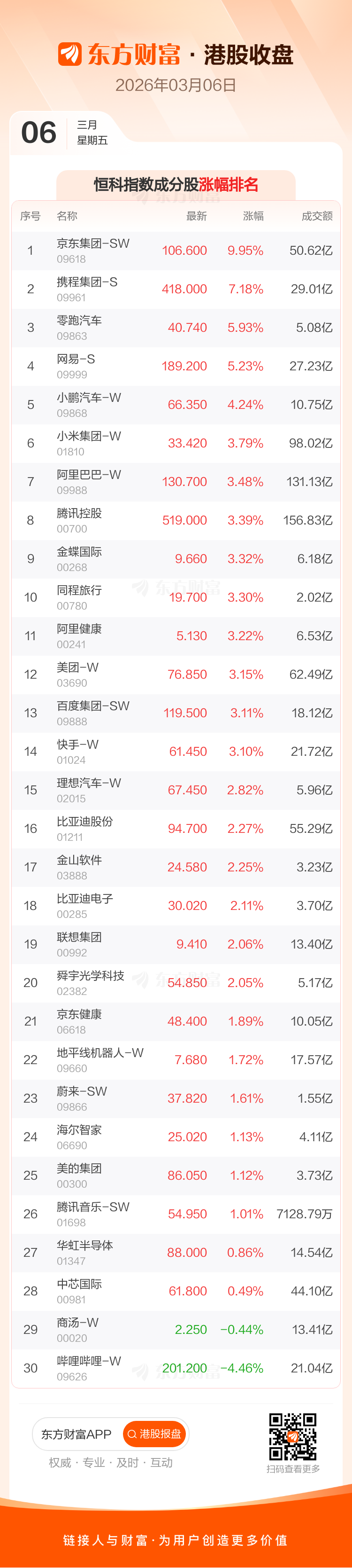 港股3月6日收盘走高,恒生指数收报25757.29点,涨435.95点,涨幅1.72%;恒生科技指数收报4947.5点,涨151.17点,涨幅3.15%。恒生指数成分股中京东物流、京东集团-SW、吉利汽车涨幅居前,中国宏桥、恒基地产、新奥能源跌幅靠前。恒生科技指数成分股中京东集团-SW、携程集团-S、零跑汽车涨幅居前,哔哩哔哩-W、商汤-W跌幅靠前。