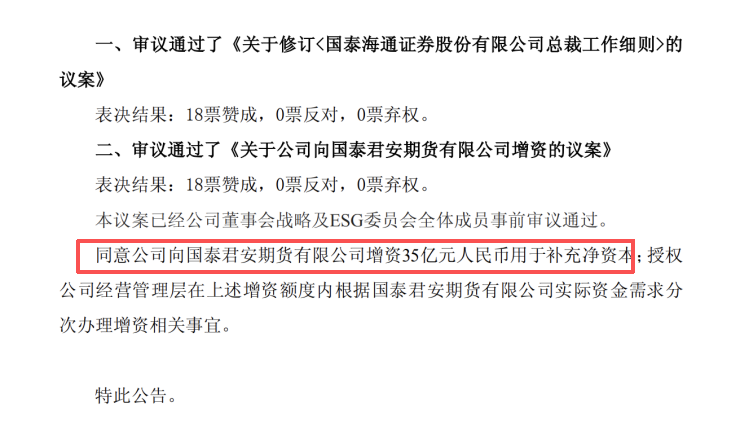 3月6日,国泰海通证券发布公告称,董事会同意公司向子公司国泰君安期货增资35亿元,用于补充其净资本。