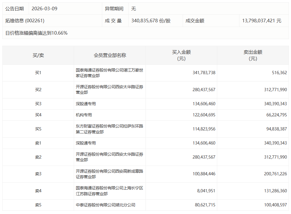 拓维信息今日涨停,成交额137.98亿元,换手率29.75%。盘后龙虎榜数据显示,深股通专用席位买入1.35亿元并卖出3.40亿元,1家机构专用席位净买入5637.99万元。国泰海通湛江万豪世家证券营业部净买入3.41亿元。