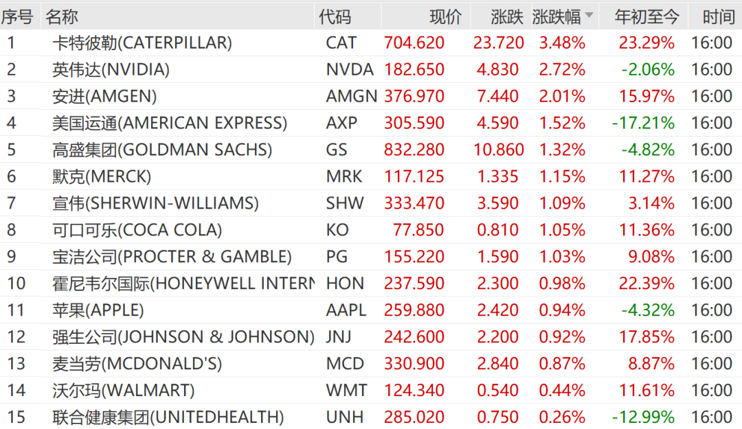 卡特彼勒涨3.48%,英伟达涨2.72%,安进涨2.01%,领涨道指。