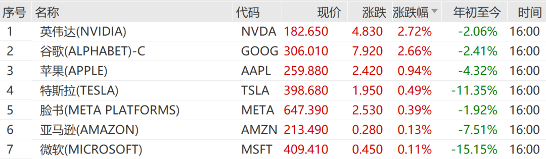 个股方面,英伟达涨2.72%,谷歌涨2.66%,苹果涨0.94%,领涨美国科技七巨头。
