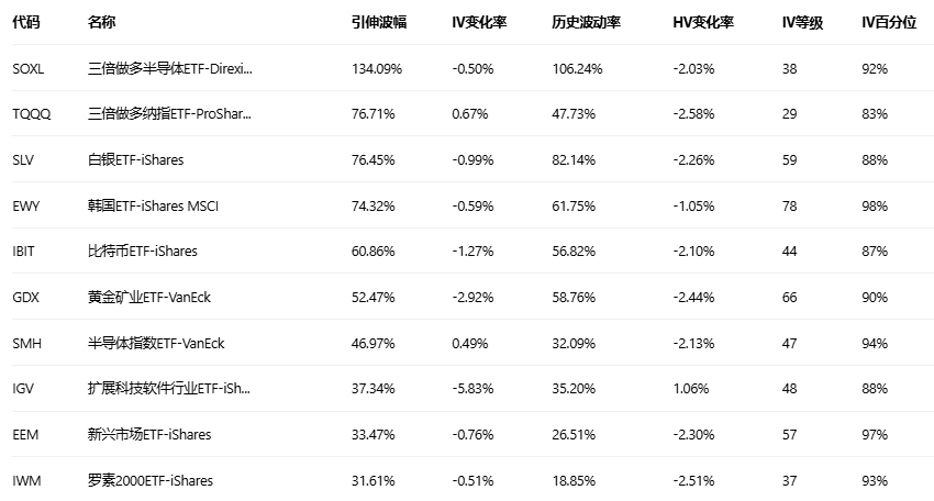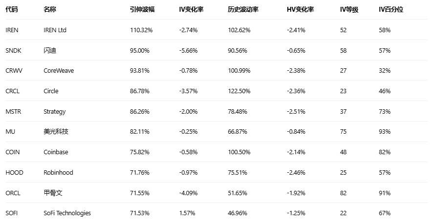 引申波幅排行榜(标的市值>10亿美元,且期权成交量>10万)