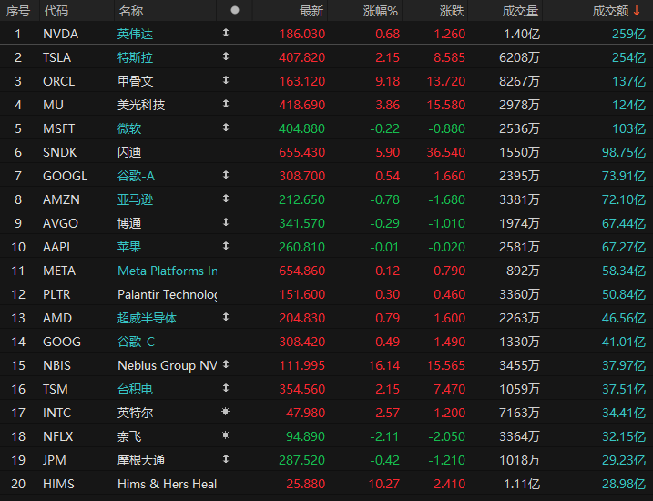 第3名甲骨文收高9.18%,成交137亿美元。令投资者印象深刻的不仅仅是其业绩超出分析师预期。虽然投资者无疑对甲骨文2026财年第三季度172亿美元的营收印象深刻(同比增长22%,且高于分析师预期的169亿美元),但公司的利润更是给他们带来了惊喜。分析师普遍预期为1.23美元,但公司公布的2026财年第三季度调整后每股收益为1.79美元。