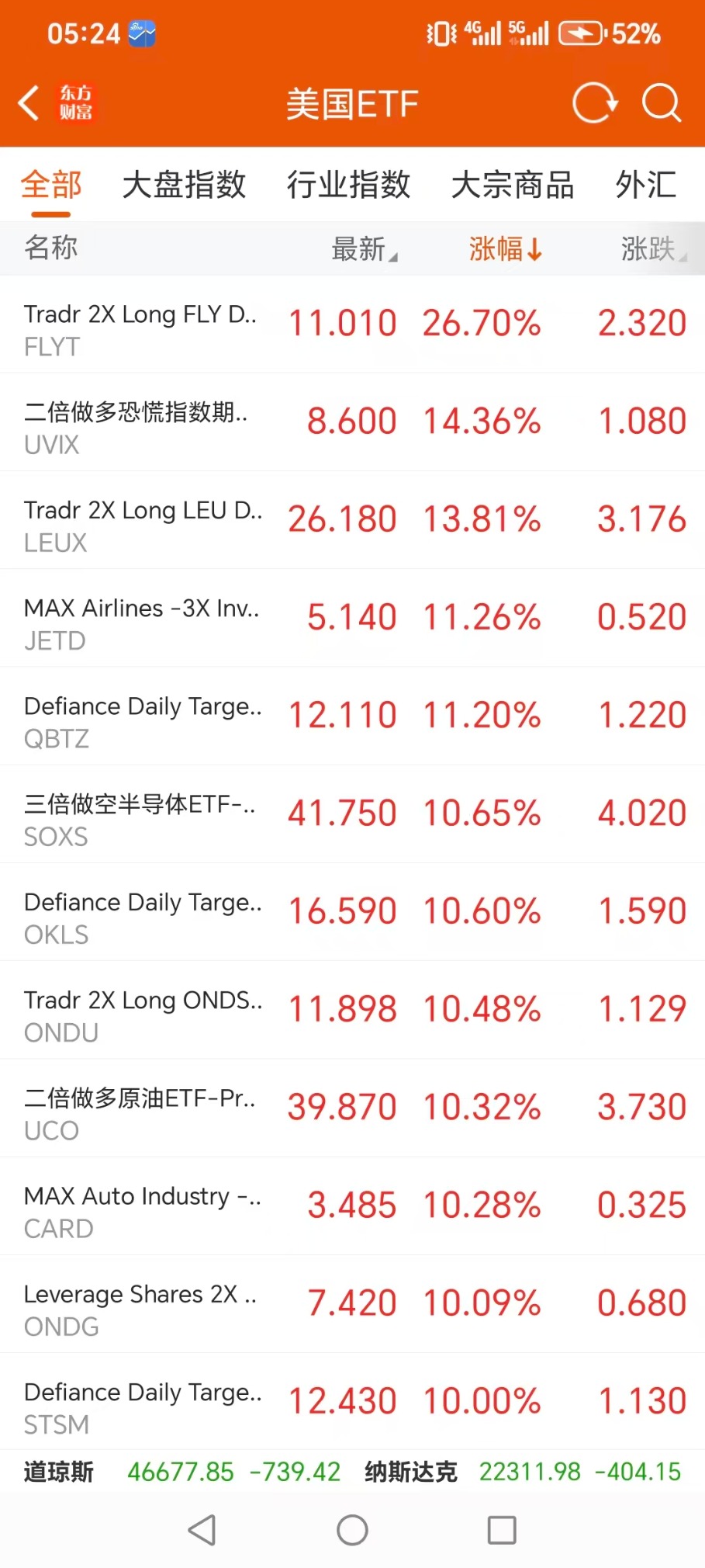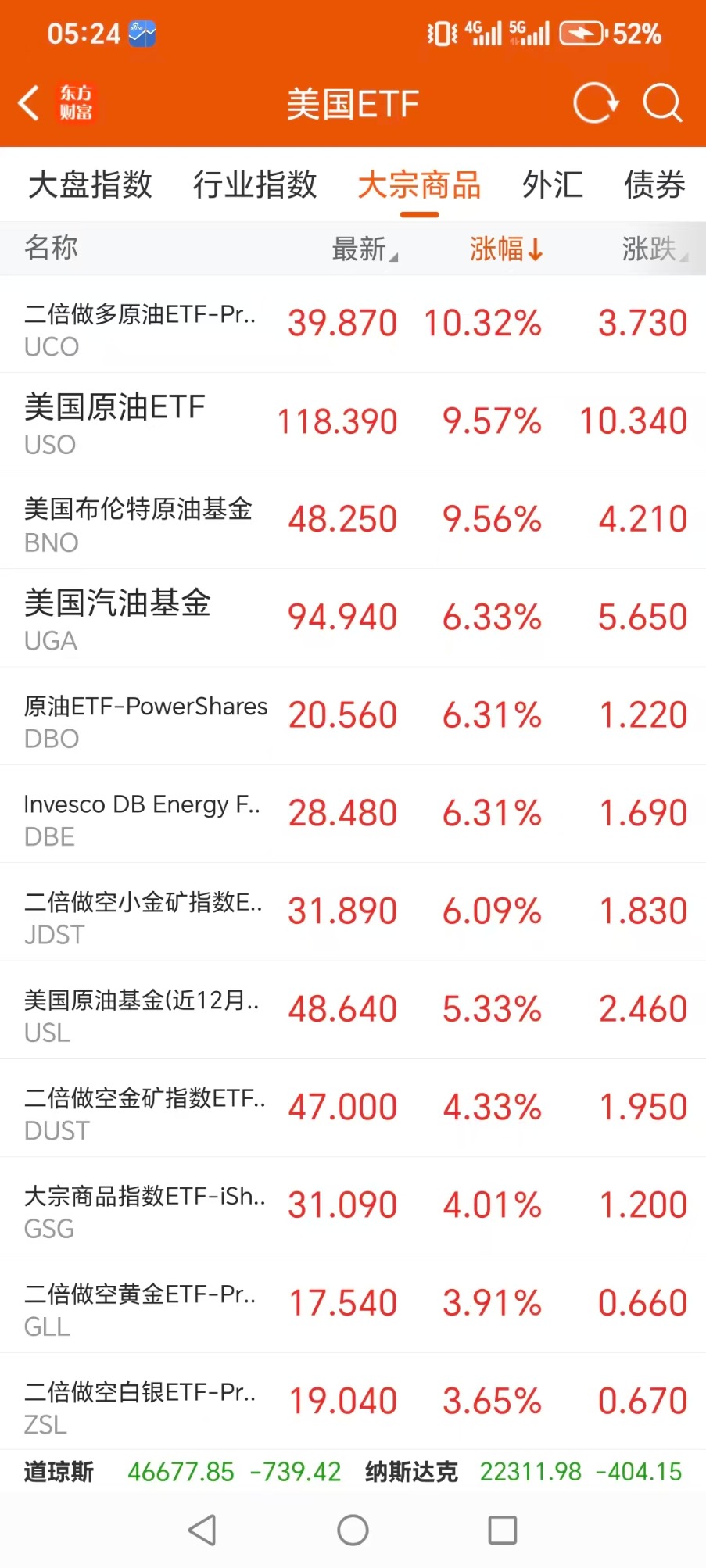 2倍做多彭博原油ETF-ProShares(UCO.US) 升超 10.32%,成交额 9.23 亿美元。