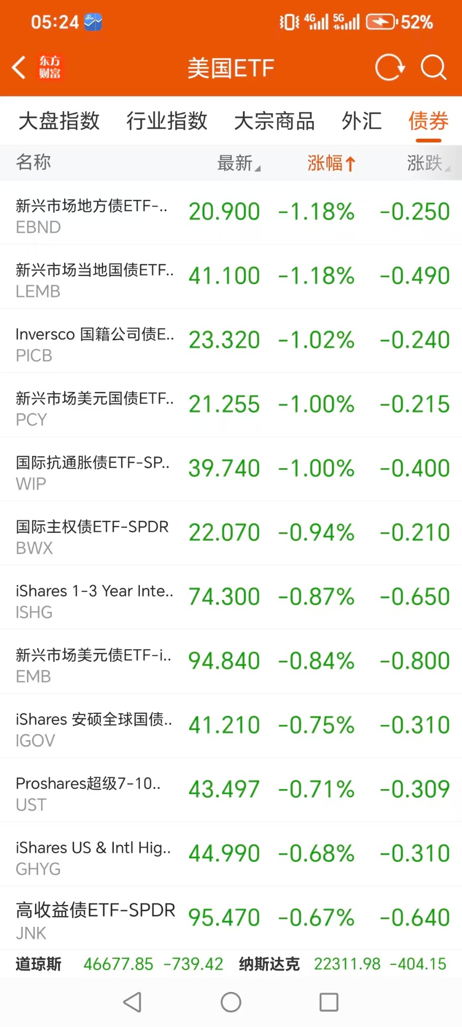 新兴市场主权债-PowerShares(PCY.US) 跌超 1.00%,成交额 446.52 万美元。