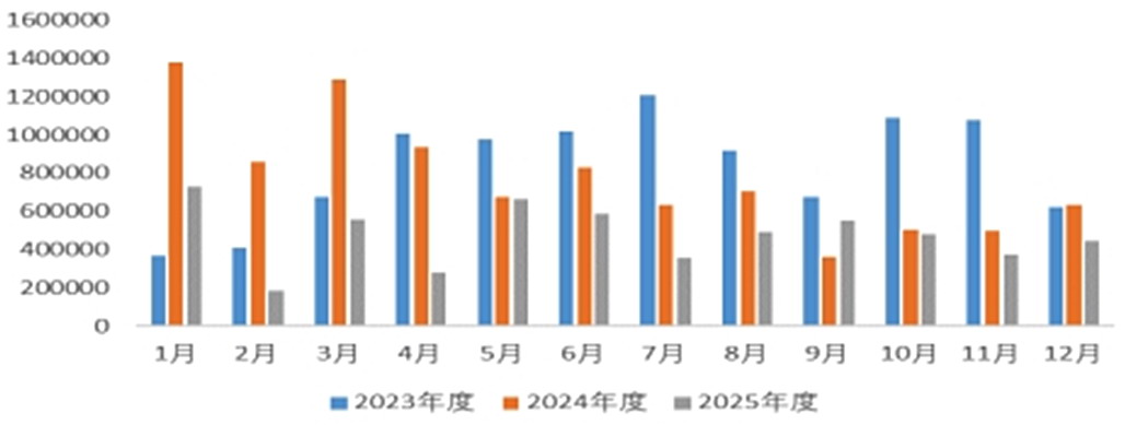 图为中国自伊朗月度铁矿石进口量(单位:吨)