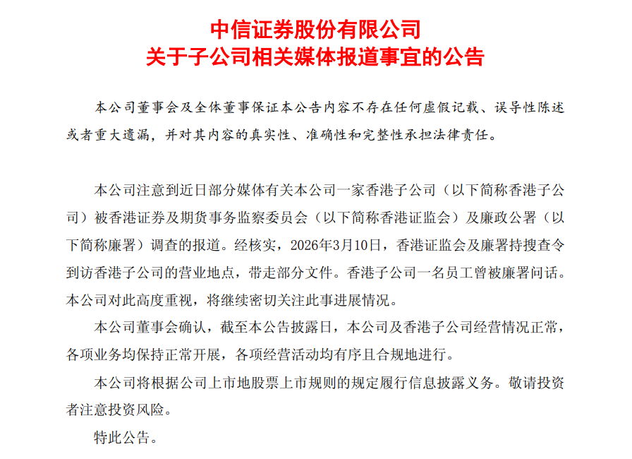 3月12日晚,中信证券发布公告称,“本公司注意到近日部分媒体有关本公司一家香港子公司(以下简称香港子公司)被香港证券及期货事务监察委员会(以下简称香港证监会)及廉政公署(以下简称廉署)调查的报道。”