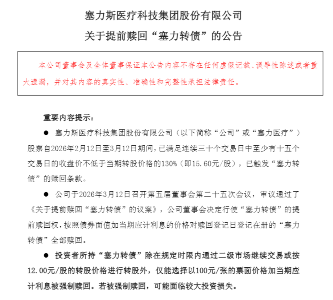 3月12日晚间,塞力医疗发布公告称,提前赎回“塞力转债”。塞力医疗表示,公司股票自2026年2月12日至3月12日,已满足连续三十个交易日中至少有十五个交易日的收盘价不低于当期转股价格的130%(即15.60元/股)这一条件,触发“塞力转债”的赎回条款。