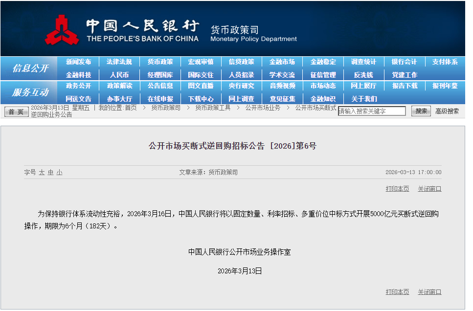 上证报中国证券网讯据中国人民银行3月13日消息,为保持银行体系流动性充裕,2026年3月16日,中国人民银行将以固定数量、利率招标、多重价位中标方式开展5000亿元买断式逆回购操作,期限为6个月(182天)。