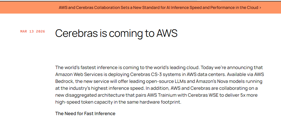 Feldman表示:“越来越多的人在使用AI,使用频率更高,并且用它来解决更复杂的问题。这使得Cerebras与Trainium的组合能够进入全球最大的云平台,同时也让我们接触到大量客户。”