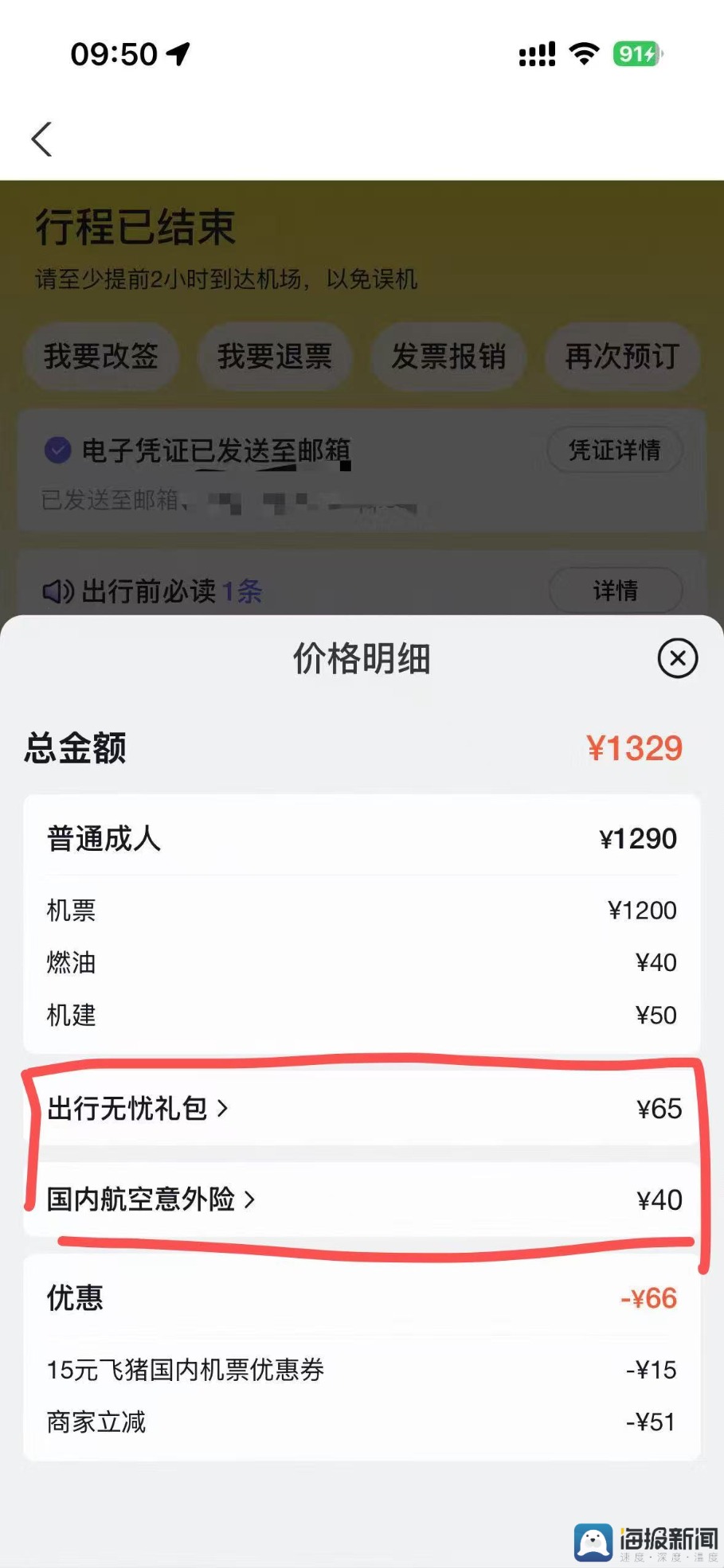 “怎么还有个出行无忧礼包和意外险啊!”订单信息显示,黄女士所购买的广州飞济南的航班实际支付1329元,其中机票1200元,燃油、机建费用90元,出行无忧礼包65元,国内航空意外险40元,虽然平台优惠了66元,仍比正常订票多花了39元。