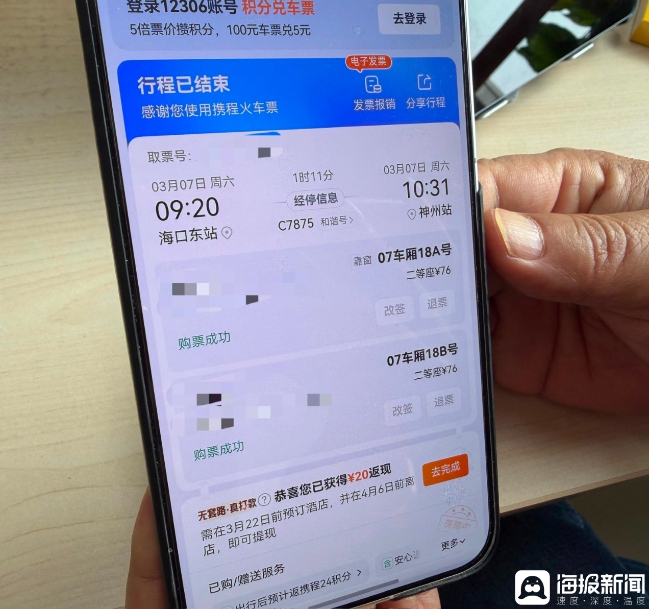 “一个小时的高铁行程76元,一个人多扣20元‘全能保障’,太坑人了!”3月11日,在携程购买高铁票的旅客郑先生向海报新闻记者感叹道。3月初,他购买的两张高铁票,每张被“搭售”了20元的付费服务。