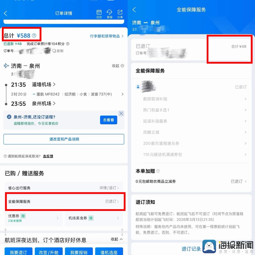姜女士向海报新闻记者提供的机票订单信息,已将“搭售”的增值服务退订。