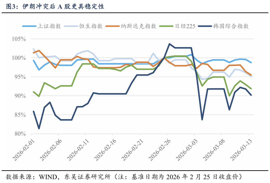 能源依赖冲击日韩产业,尤其是半导体产业链。对于日韩等出口导向+生产制造型经济体,伊朗持续封锁霍尔木兹海峡,不仅短期冲击生产成本,更体现在物理性“断供”风险。截至2024年,韩国的净原油进口占原油总供应量的98.6%,其中霍尔木兹海峡承担了韩国约65%至68% 的进口原油运输;日本的油气进口依赖超85%。因此伊朗冲突持续冲击日韩制造业体系,导致日韩股市出现系统性风险的调整。而日韩作为全球半导体、汽车、精密仪器等产业的重要生产商,生产能源的系统性风险亦将逐步传导至相关下游产业,尤其是当前受AI需求爆发的存储芯片。