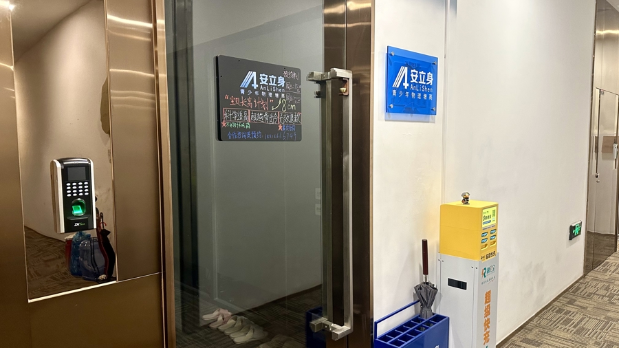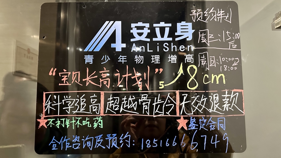 昨晚9时30分,新民晚报记者赶到现场时,该工作室大门紧闭。门口牌子上写着“宝贝长高计划5-8厘米”“科学追高、超越骨龄、无效退款、不打针不吃药”等广告语,并注明工作室为“预约制”,营业时间为“周三15时后及周日10时至18时”。