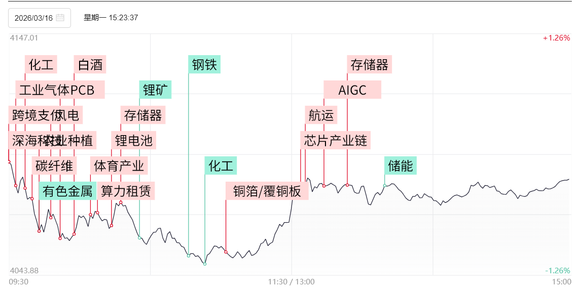 财联社3月16日电,市场探底回升,深成指收红,创业板指涨超1%。沪深两市成交额2.33万亿,较上一个交易日缩量750亿。盘面上,市场热点快速轮动,全市场超2800只个股上涨。从板块来看,存储芯片概念集体爆发,佰维存储涨超12%续创历史新高,兆易创新、金太阳、朗科科技、盈新发展涨停。深海科技概念走强,东方海洋、神开股份、海洋王涨停。PCB概念表现活跃,金安国纪、超颖电子、卓郎智能涨停。航运板块午后走高,招商南油、海航科技涨停。下跌方面,储能、绿电概念持续调整,中国核建、中国电建触及跌停。煤炭板块下挫,郑州煤电大跌。截至收盘,沪指跌0.26%,深成指涨0.19%,创业板指涨1.41%。