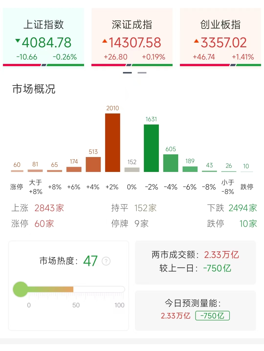 指数整体表现不弱,创业板指处于箱体上沿,沪指处于箱体下沿,午后回升走出下影线,不少短线活跃资金午后选择拿先手。早上盘中,市场短线情绪是第二次冰点,好在承接力度不弱,两市成交额也在2.3万亿上方,市场目前较大概率还是处于箱体震荡状态。由于缺少具备合力的题材,短线投资者操作难度较大,题材处于快速轮动状态。从指数技术形态看,上证指数在4084点附近受到一定阻力,短期均线系统呈现粘合态势,量能连续缩量至23253亿元(较前日减少约750亿元),反映场内博弈分歧加大。创业板指表现相对强势,日内探底回升逻辑完整,技术上已连续数日站稳关键均线位置,成为市场多头的支撑锚。