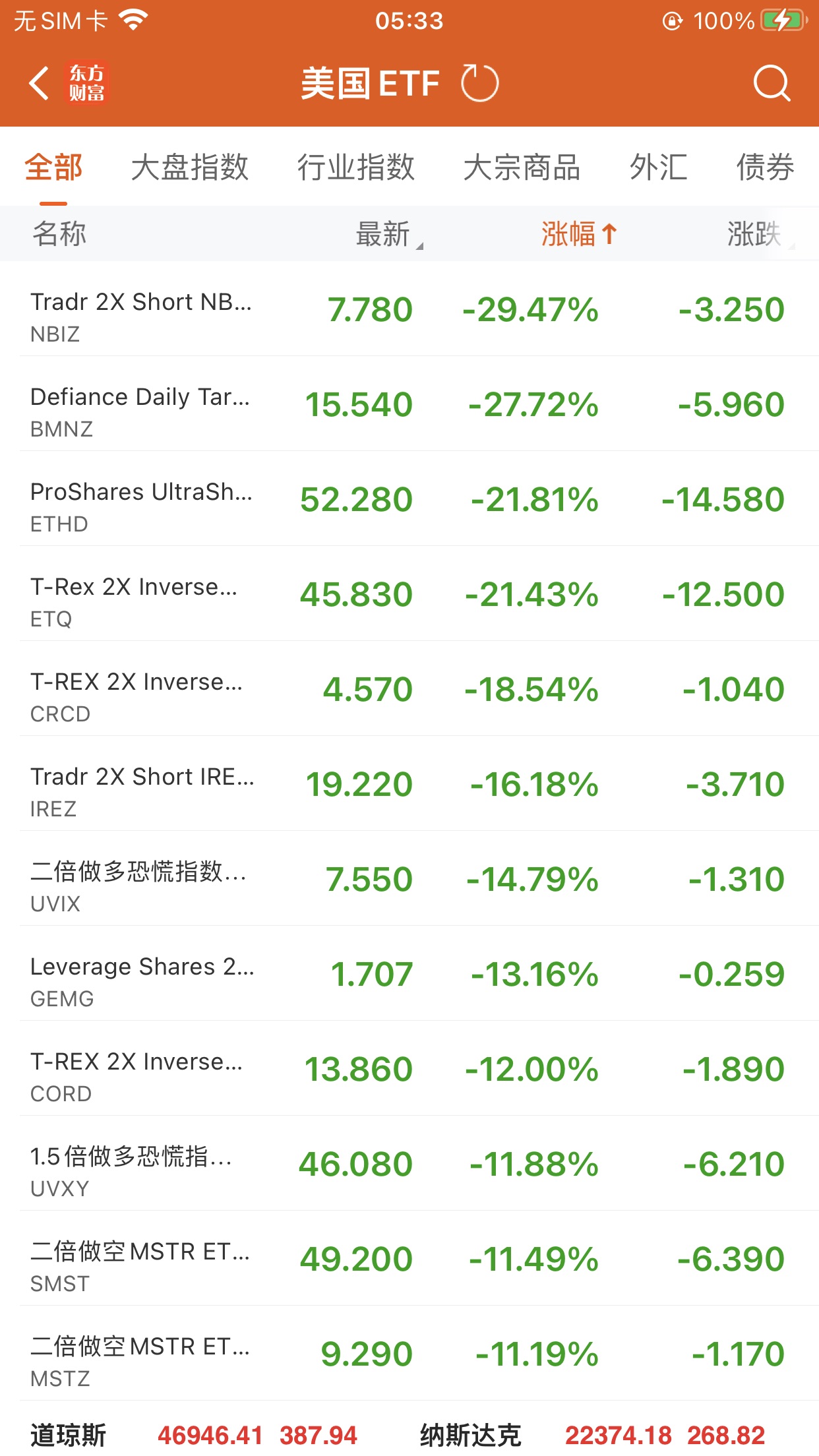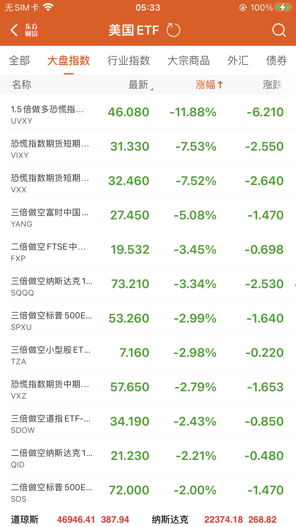 美股大型指数ETF跌幅榜Top5