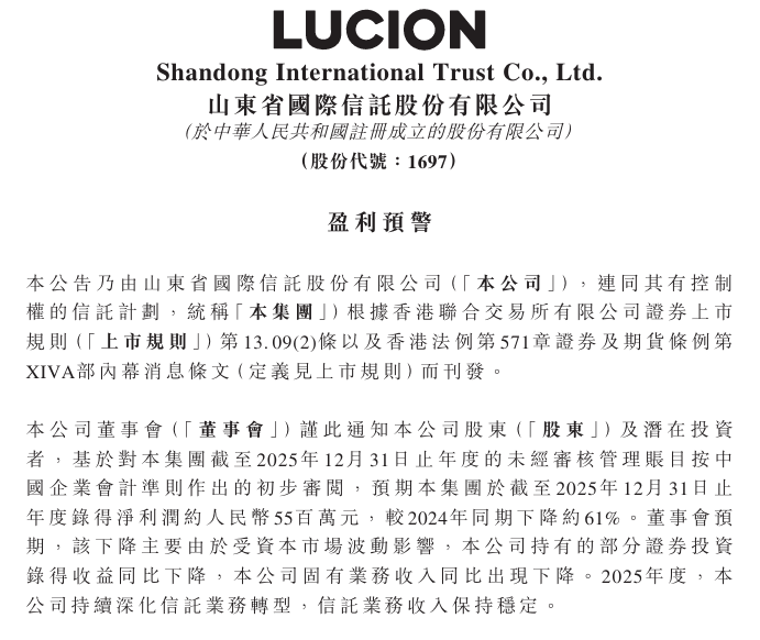 3月16日晚间,山东国信(01697)发布公告,预期本集团于截至2025年12月31日止年度取得净利润约人民币5500万元,较2024年同期下降约61%。
