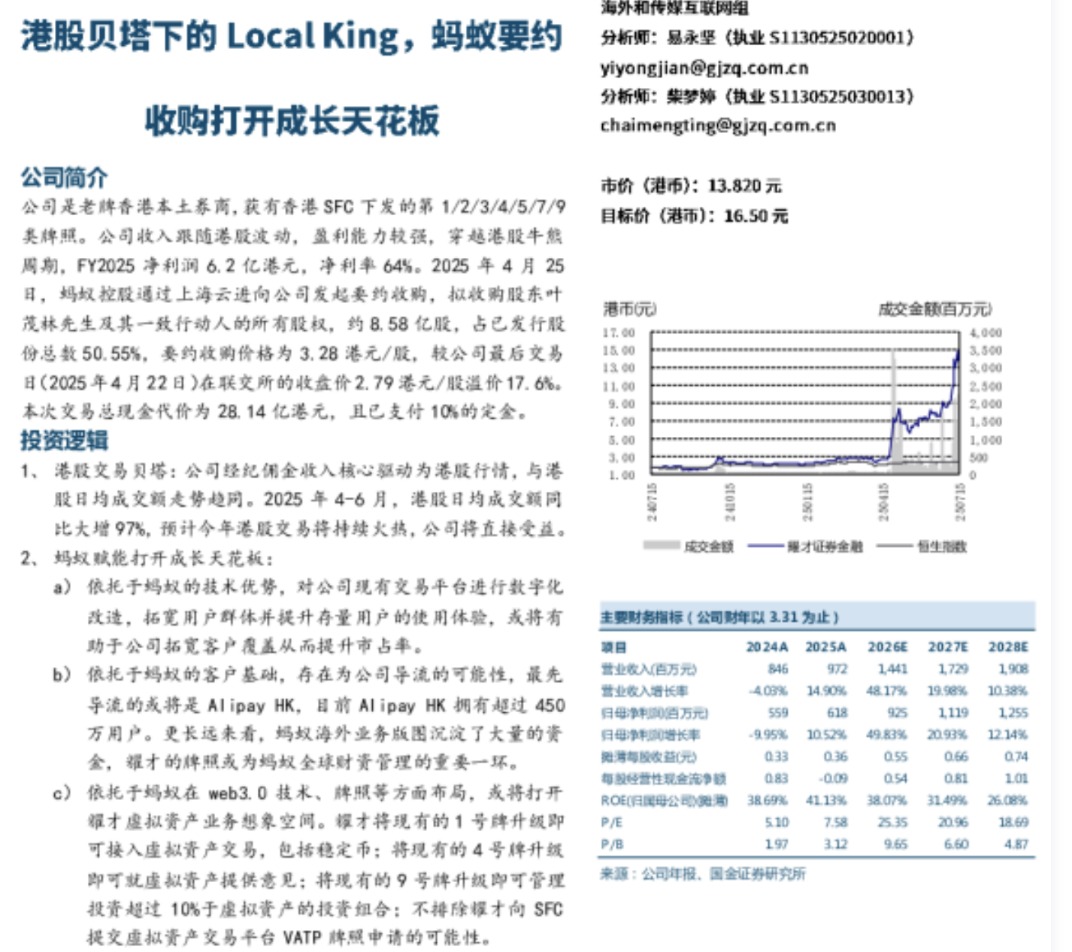 2025年4月25日,蚂蚁集团通过全资子公司上海云进的境外持股平台,向耀才证券主席叶茂林持有的新长明控股发起收购,拟以每股3.28港元的价格拿下50.55%的控股权,较当时收盘价溢价约17.6%,复牌首日,耀才股价暴涨81.97%。
