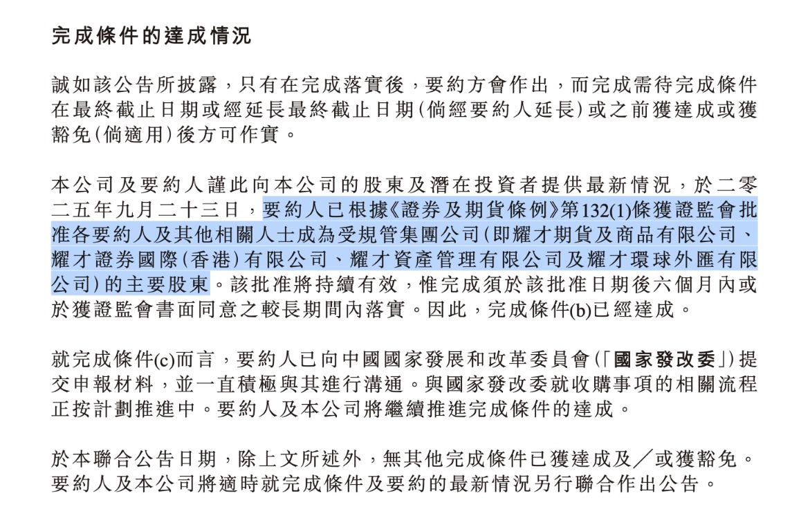 真正的转折点出现在2025年11月25日,耀才证券金融公告,由于需要更多时间完成向国家发改委的申报,双方签订修订协议,将收购要约延长4个月至2026年3月25日,并追加了1.64亿港元的按金。直到今年3月16日,一切尘埃落定,公告显示,香港证监会的审批将同步延期至4月30日,为交割留足空间,而就在3月17日复牌后,截至发稿,耀才证券金融报16.06港元/股,上涨超过70%。