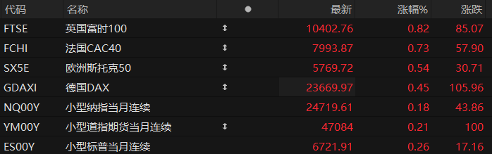 周二盘前,美股三大股指期货齐涨,欧洲主要指数普遍上涨。截至发稿,纳斯达克100指数期货涨0.18%,道指期货涨0.21%,标普500指数期货涨0.26%。