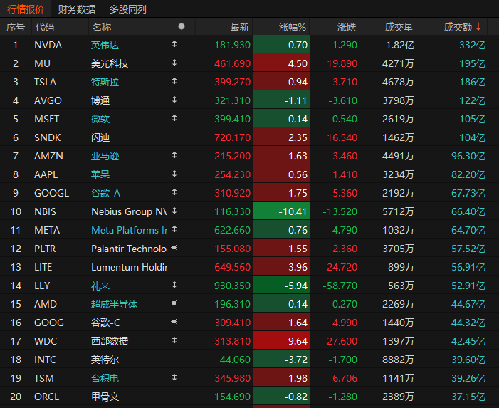 第2名美光收高4.50%,成交195亿美元。美光科技成为本轮美股科技股调整以来,首个创下历史新高的主要科技股票。其他存储股也表现亮眼。