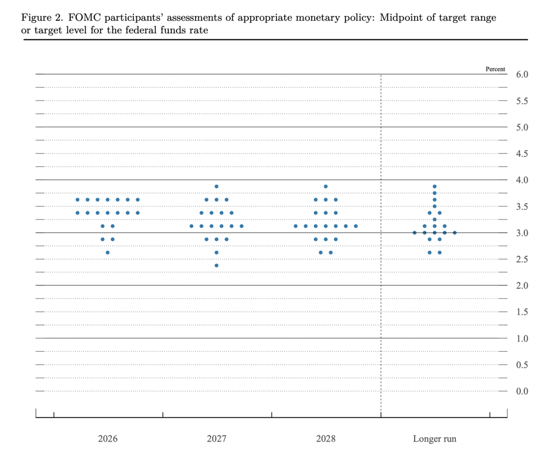 会后公布的点阵图显示,美联储官员维持2026年降息一次、2027年降息一次的预测。具体来看,在19名联储官员中,有7人预计今年不会降息,7人预计降息一次,2人预计降息两次,2人预计降息三次,还有1人预计降息四次。在明年的利率预期方面,有一名官员预计会有一次加息。