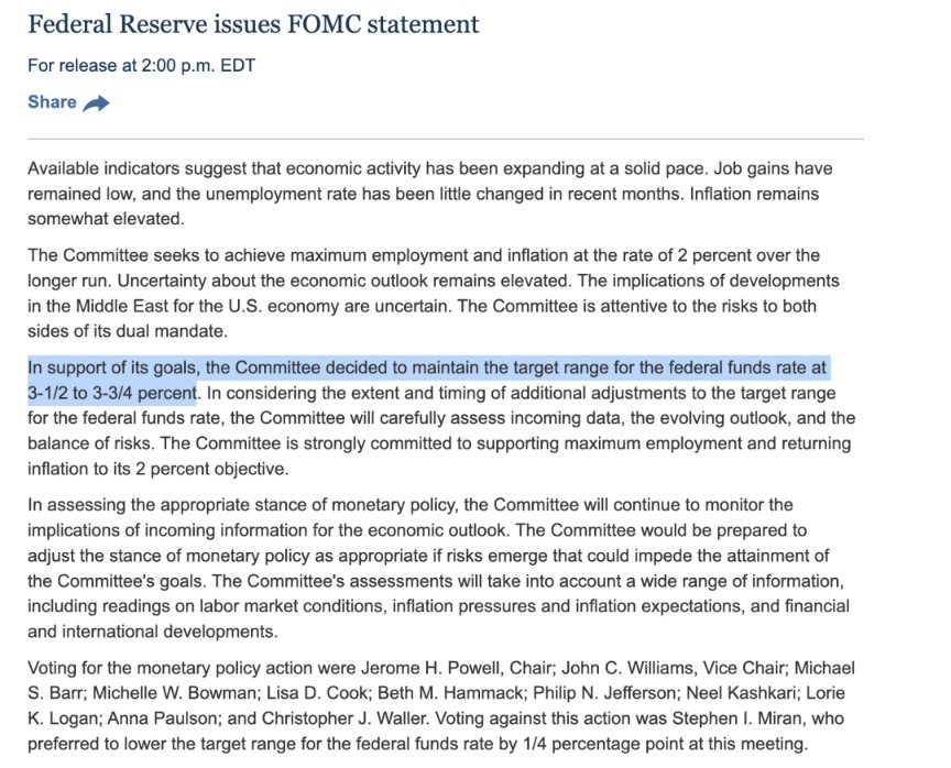 FOMC声明显示,委员们以11-1的投票比例通过此次的利率决定。投票反对的是由美国总统特朗普提名的美联储理事斯蒂芬·米兰,他主张在本次会议上降息25个基点。