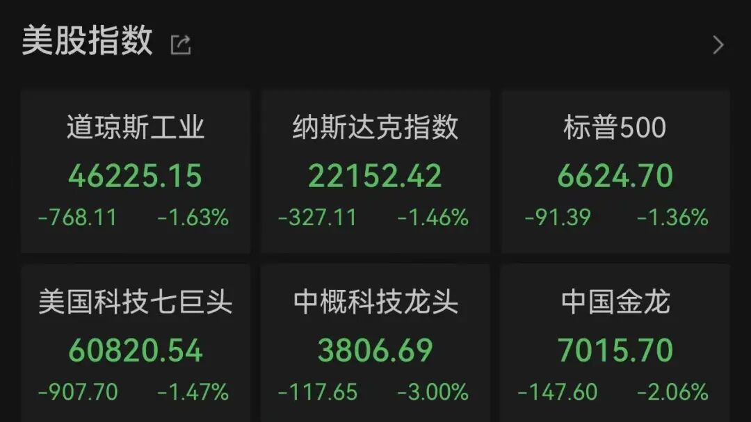 美东时间3月18日,美股三大指数集体收跌。截至收盘,道指下跌768.11点,收于46225.15点,跌幅为1.63%;标普500指数下跌91.39点,收于6624.7点,跌幅为1.36%;纳指下跌327.11点,收于22152.42点,跌幅为1.46%。