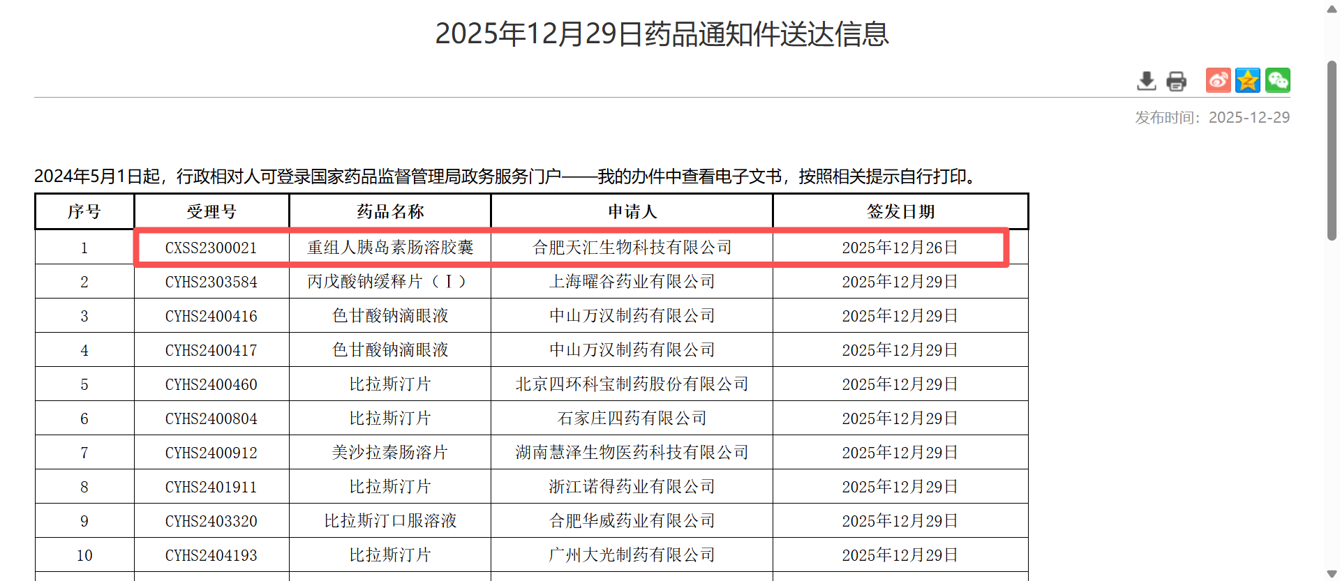 华润系的离场,或与天麦生物核心管线的进展不及预期相关。2025年底,药品监督管理局官网显示,天麦生物参股的合肥天汇生物所申报的重组人胰岛素肠溶胶囊(ORMD-0801),被列入当日药品通知件送达信息列表,这一结果意味着该款药物的上市注册申请未能获得批准。