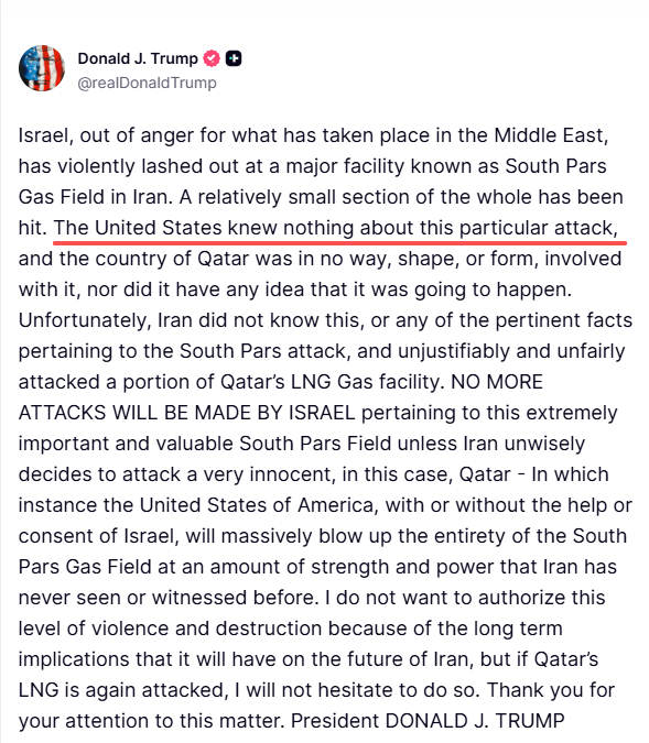 这一说法与美国媒体当天报道不符。据《华尔街日报》18日报道,美国官员说特朗普事先获悉以色列对伊朗南帕尔斯气田的袭击,并表示支持,将其视为就伊朗实际关闭霍尔木兹海峡向伊朗政府发出的信号。